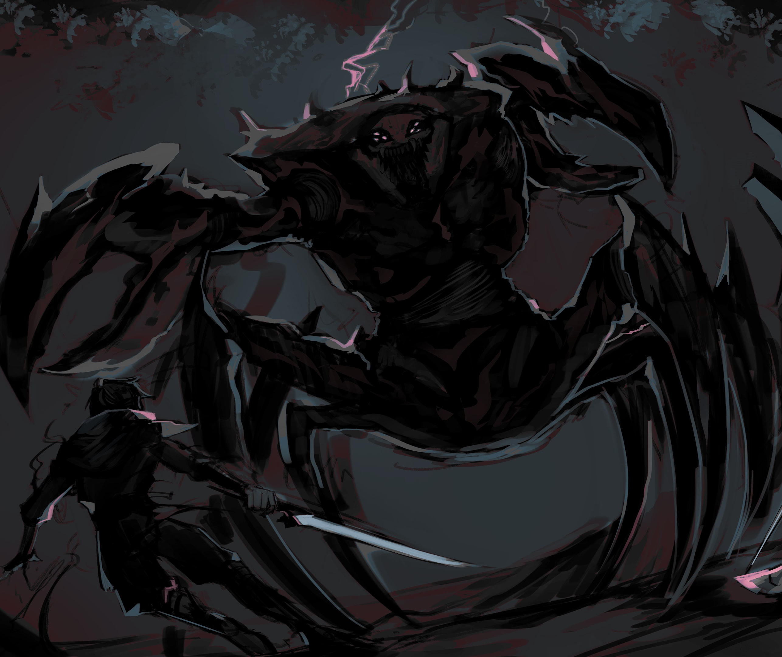 "Each Carapace Scavenger had four pairs of long, segmented legs that ended in scythe-like protrusions. At the front, a human-like torso was protruding from the carapace, also clad in thick chitinous armor. The head, if it was even the appropriate word, was situated directly on top of the torso, with no neck in between. It had two narrow eye slits and a vicious-looking mouth with several slimy mandibles. Instead of hands, the monster had two enormous pincers."