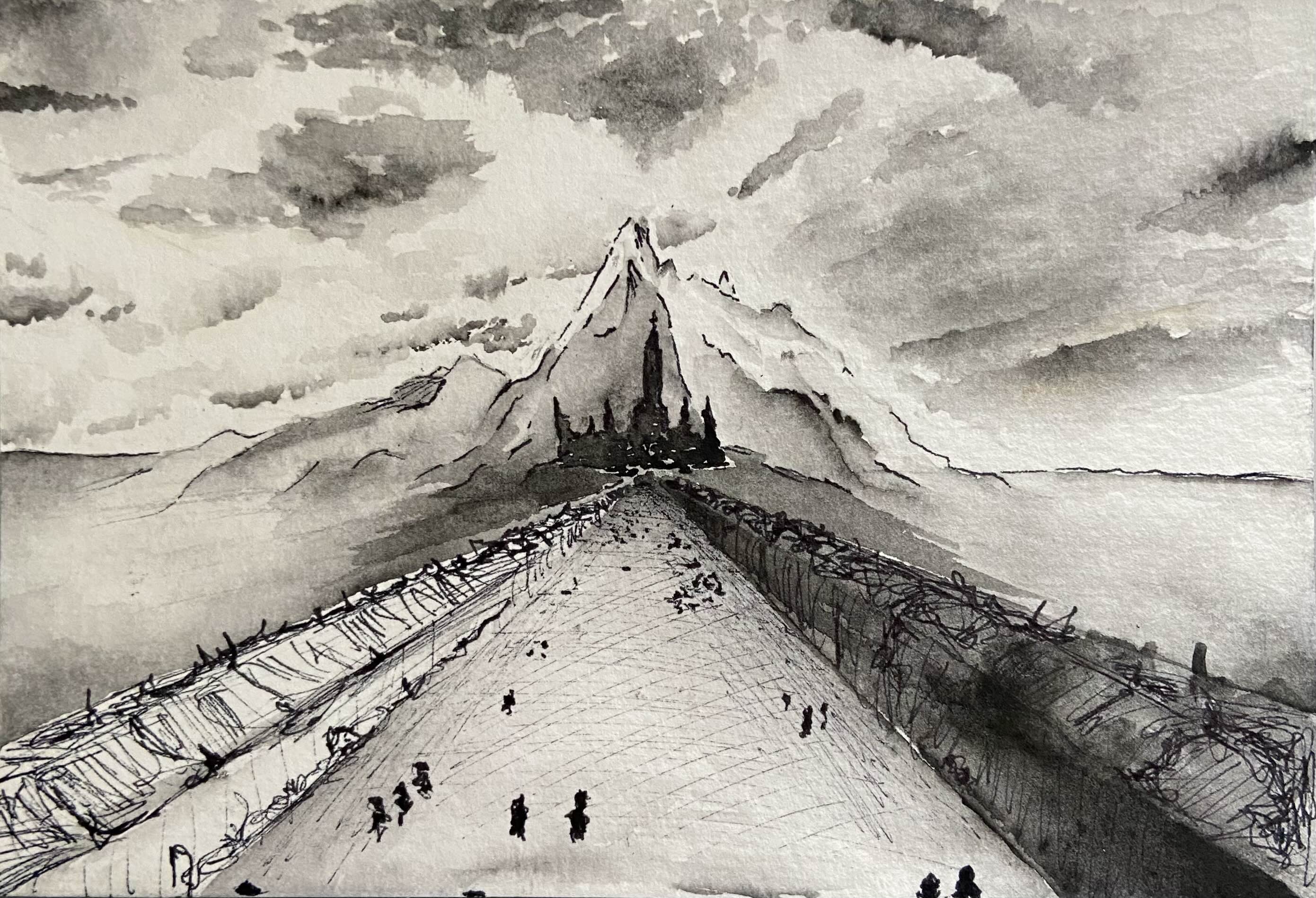 In front of the palace, a titanic stone bridge of insurmountable proportions spans the vast chasm between the mountain and the volcano standing opposite of it – connecting two separate branches of the aforementioned mountain chain like a road build for giants. Its black pillars are decorated with intricate engravings.[2]